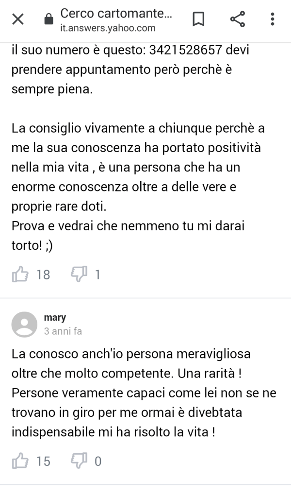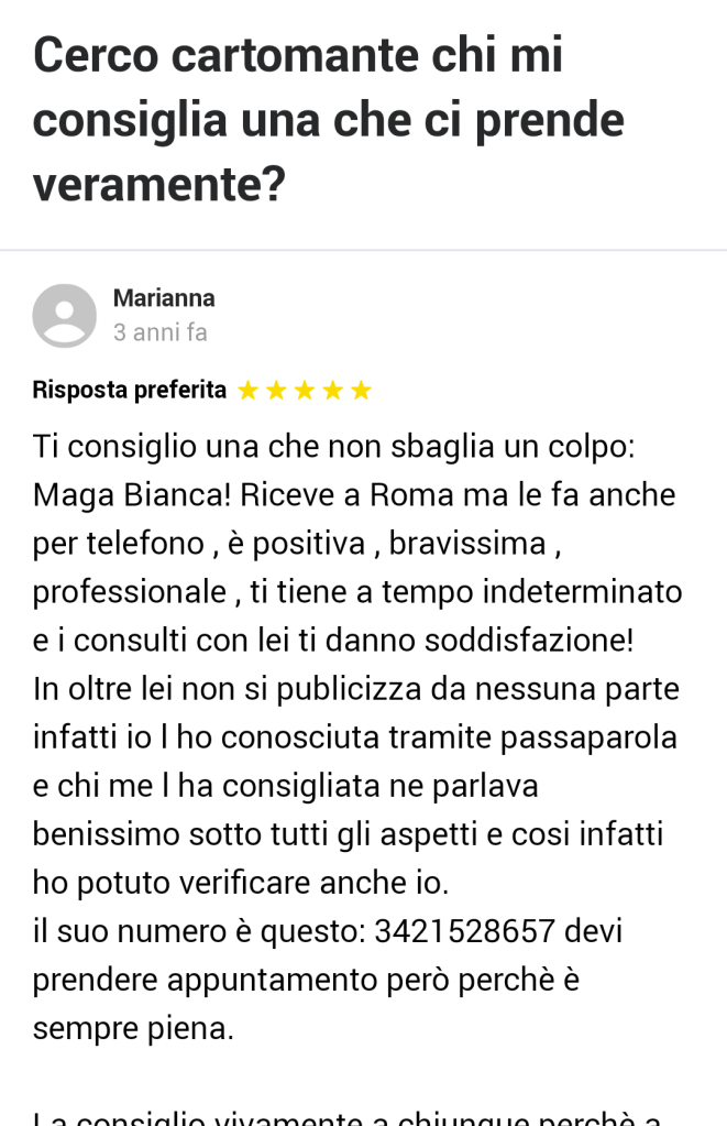 Cerco cartomante chi mi consiglia una che ci prende veramente? – Yahoo Answers Pubblicato daLa Maga bianca3 Maggio 202115 giugno 2021Pubblicato in: recensioni, Senza categoriaTag:bianca, brava, cartomante, cerco, conosce, consigli, consiglia, empatica, esperta, La maga bianca, maga, orgoniti, prove, recensioni, rituali, ritualista, sensitiva, seria, tarocchi, telefono, umana Queste sono alcune delle tante recensioni pubblicate nel tempo che parlano di me… Mi piace Caricamento... Correlati