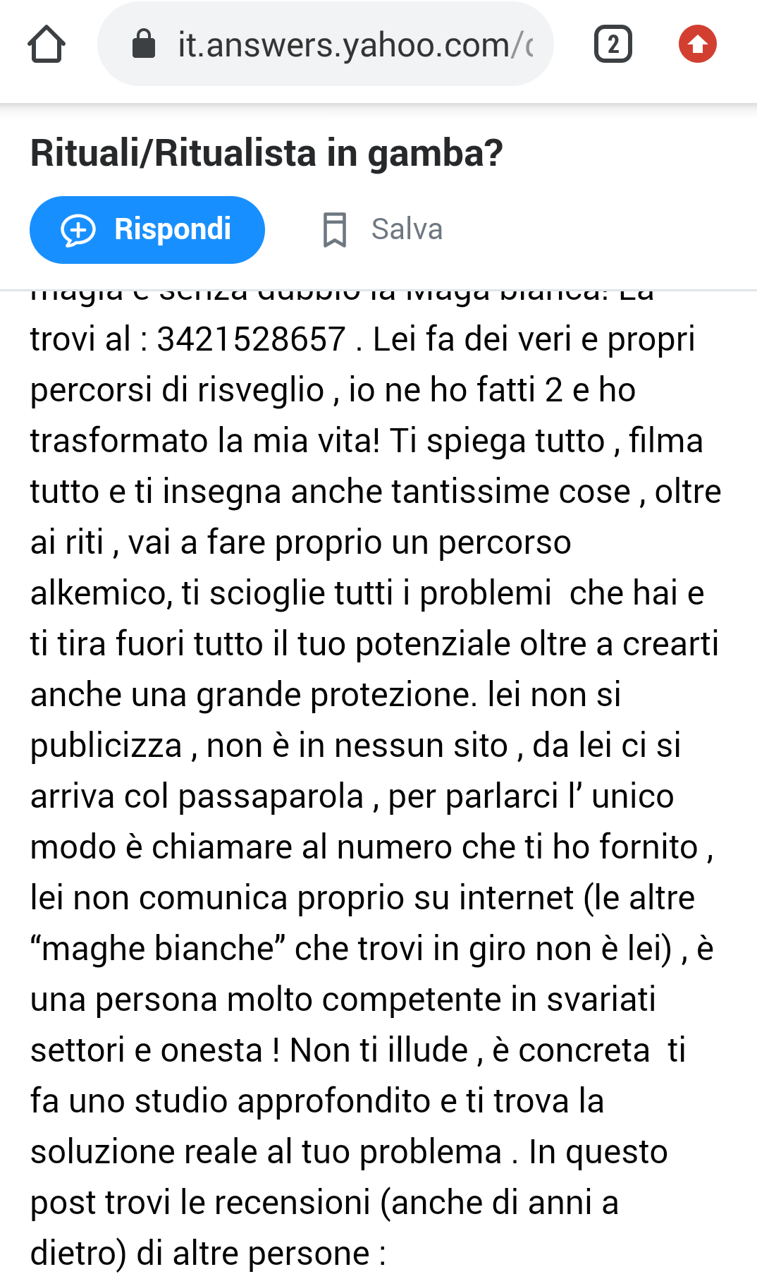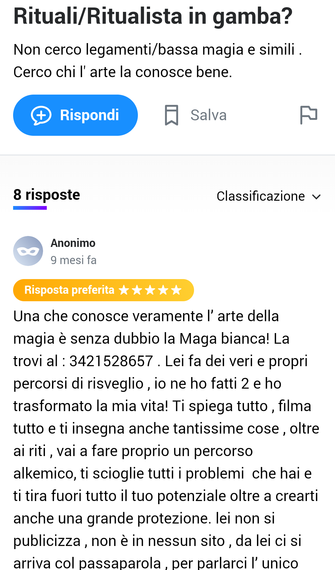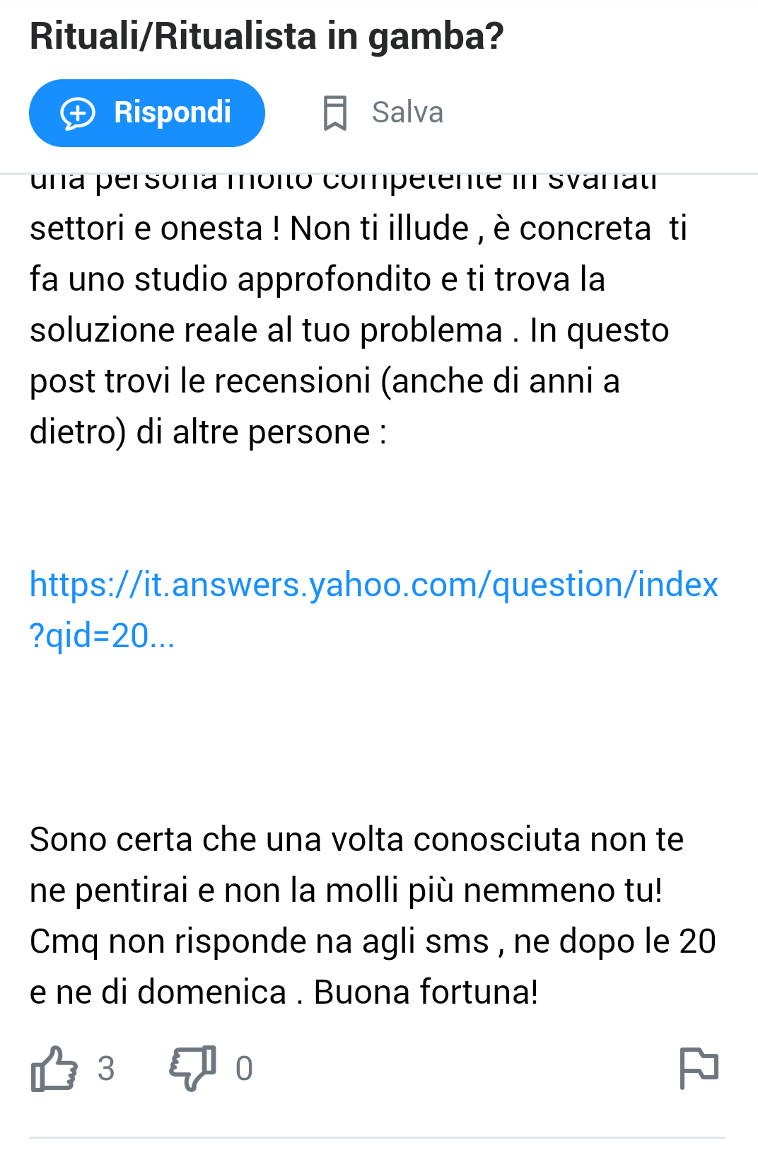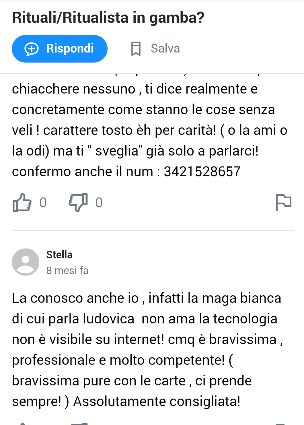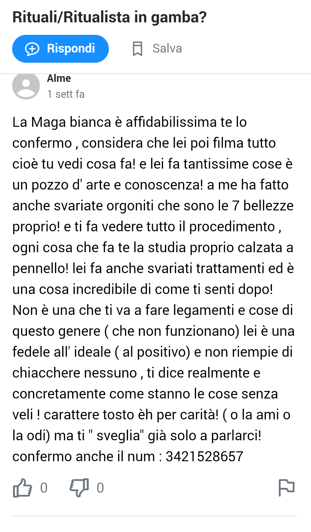 Rituali/Ritualista in gamba? – Yahoo Answers Pubblicato daLa Maga bianca3 Maggio 202115 giugno 2021Pubblicato in: recensioni, Senza categoriaTag:affidarmi, bianca, brava, cartomante, cerco, conosce, consigli, consiglia, empatica, esperta, funziona, La maga bianca, maga, orgoniti, percorsi, prove, recensioni, rituali, ritualista, sensitiva, seria, tarocchi, telefono, umana E ancora! Mi piace Caricamento... Correlati